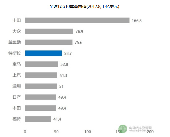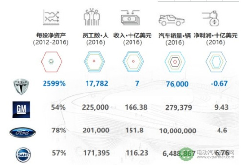 特斯拉(Tesla)2016年銷7.6萬輛汽車,僅為福特的0.76%,哈弗H6在中國一個半月的銷量;2017年營收僅占比豐田的0.03%、通用的5%;市值卻一度躍升至全球No.4,其高市值表明市場對于電動汽車的前景非??春?。