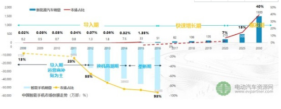 如同2012年之前智能手機尚處于導入期、隨后迎來換機高潮期一樣,國內新能源汽車行業(yè)目前已從導入及市場培育階段躍入快速增長期。預計2020年其將迎來市場爆發(fā)期,隨后十年市場占有率有望從7%躍升至40%。在萬物互聯(lián)的世界,純機械驅動的傳統(tǒng)發(fā)動機將像恐龍一樣滅絕。