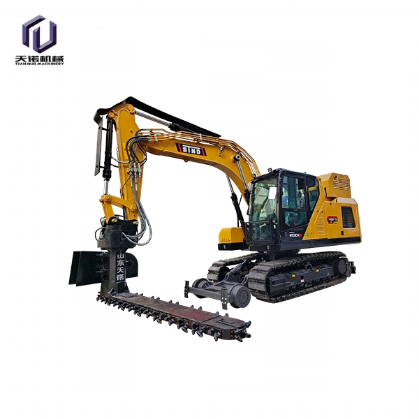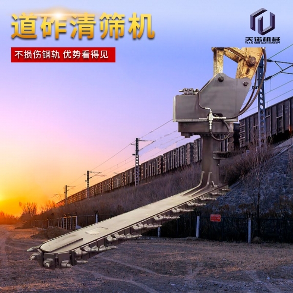 目前,鐵路交通發(fā)展迅速,對于年久的鐵路路基下面的石子需要定期更換,對于鐵路上的清渣機需要大型設備操作十分的不方面,采用人工又十分耗時,工作效率比較低下;為解決上述問題,克服現有技術的不足,天諾工程機械研發(fā)了一種能夠在狹小空間內作業(yè)、操作簡單、效果高的鐵路清渣機;鐵路清渣機包含扒渣鏈部、清渣板部、安裝部和連接部,安裝部設置在扒渣鏈部的上部,其用于與挖掘機連接;清渣板部設置在扒渣鏈部的尾端,清渣板部和扒渣鏈部通過連接部相連;扒渣鏈部包括鏈條,鏈條由若干首尾相連的鏈節(jié)組成,鏈節(jié)包括支座和設置在支座上的截齒;若干截齒呈波浪式陣列布置;安裝部包括上座板和下座板,上座板和下座板之間設置有回轉支承,上座板上部設置有兩個相互平行的大耳板。鐵路清渣機是為鐵路道咋清理而設計的一款鐵路專用屬具,鏈條式道咋清理機需安裝在150挖掘機前端,并從軌道外側位置清理,通過大扭矩馬達帶動免維護鏈條上作業(yè)鏈條上裝置超耐磨的合金屬具對道床道砟進行連續(xù)清理的技術,排列使得道砟的清理及更換更加簡單高 效,提高了施工速度同時節(jié)省了勞動力。